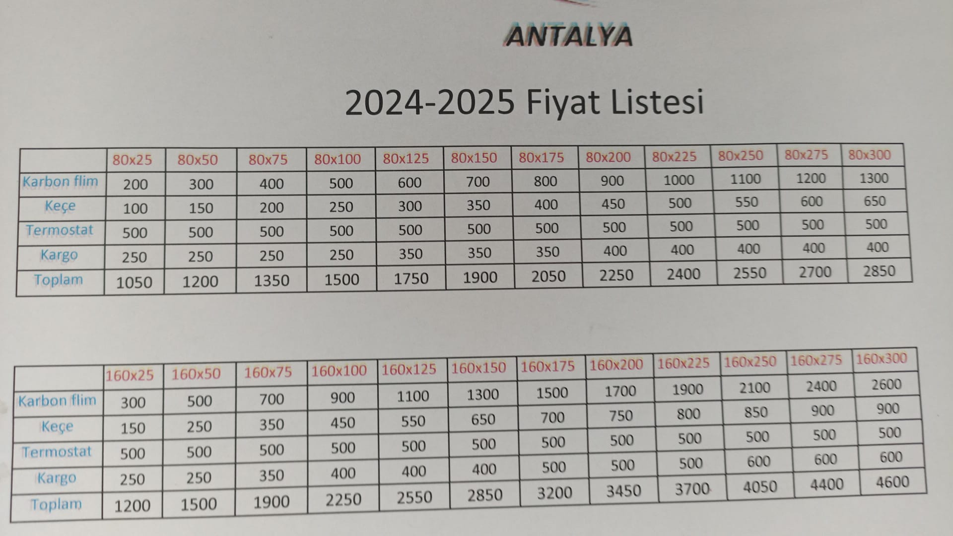 Ev halı altı ısıtıcıları için aşağıda fiyat listesi mevcuttur.